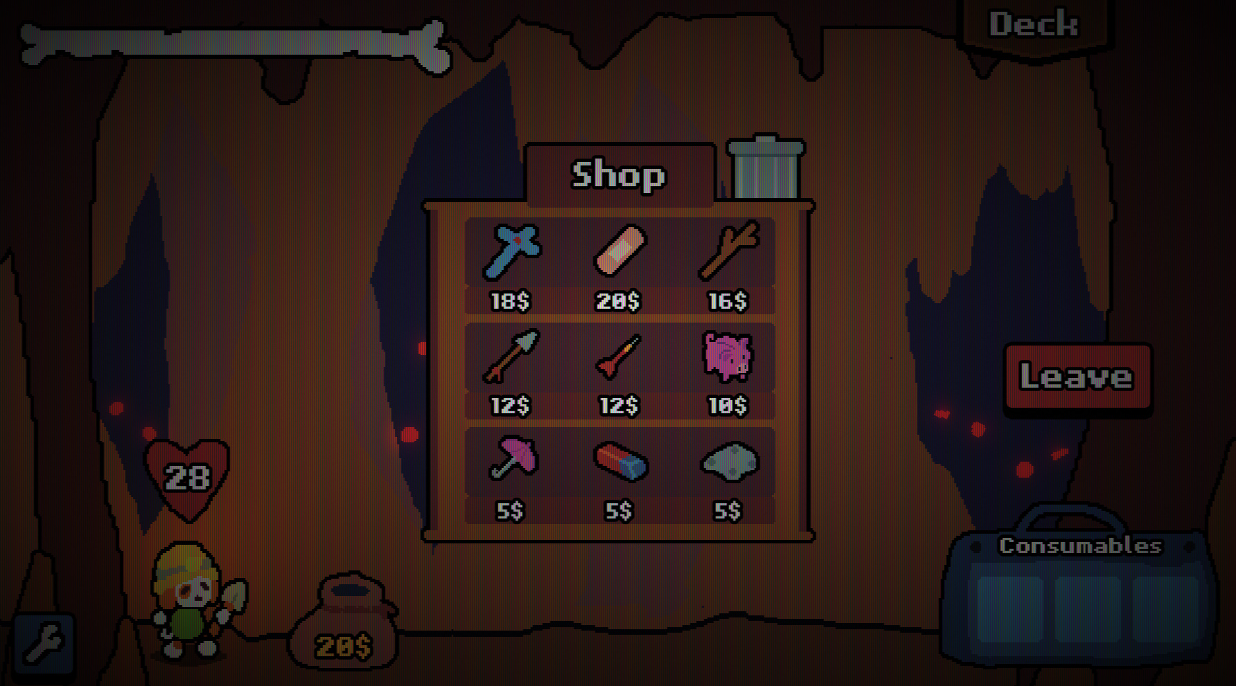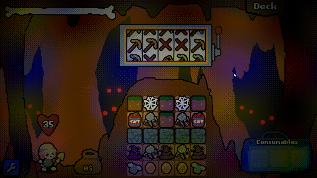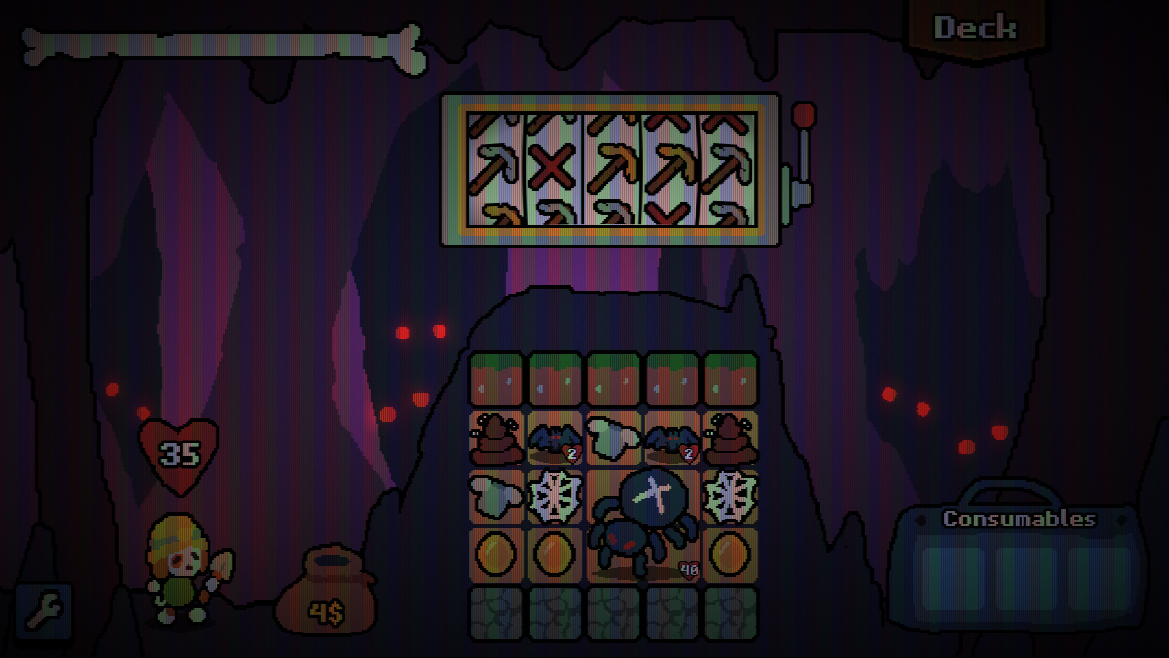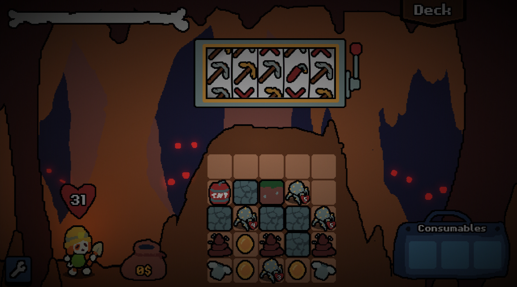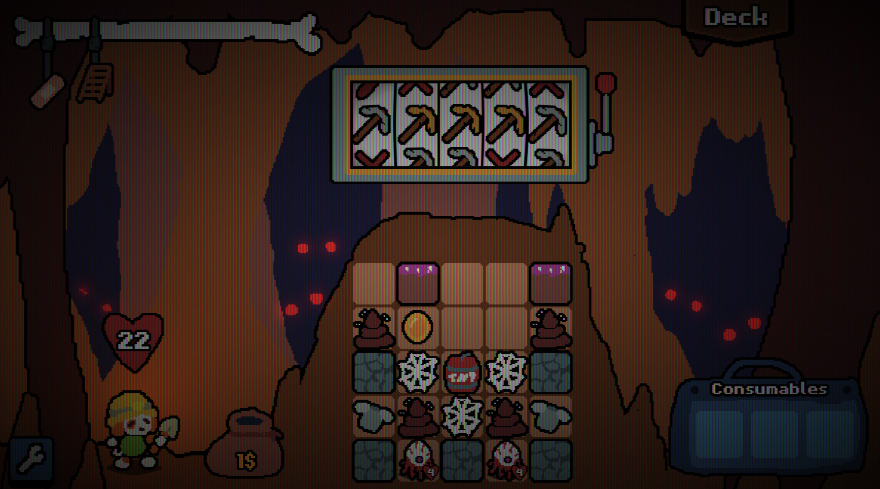 A dark roguelike where a slot machine decides your fate. Spin the reels to generate five items each turn, rearrange them strategically, and unleash them from top to bottom onto a 5×5 grid, crushing blocks and slaying twisted cave monsters.